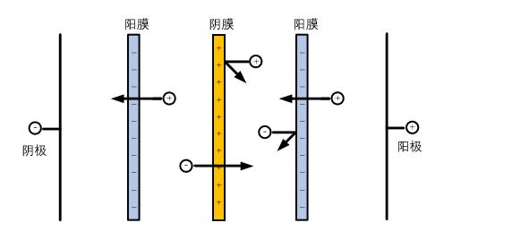 分為電滲析陰膜和電滲析陽膜兩種,陰膜具有透過陰離子而阻擋陽離子的特性,陽膜具有透過陽離子而阻擋陰離子的特性。將陰膜和陽膜交替排布,在直流電場的作用下,可實現(xiàn)鹽分的遷移,從而實現(xiàn)鹽分的脫除或濃縮。